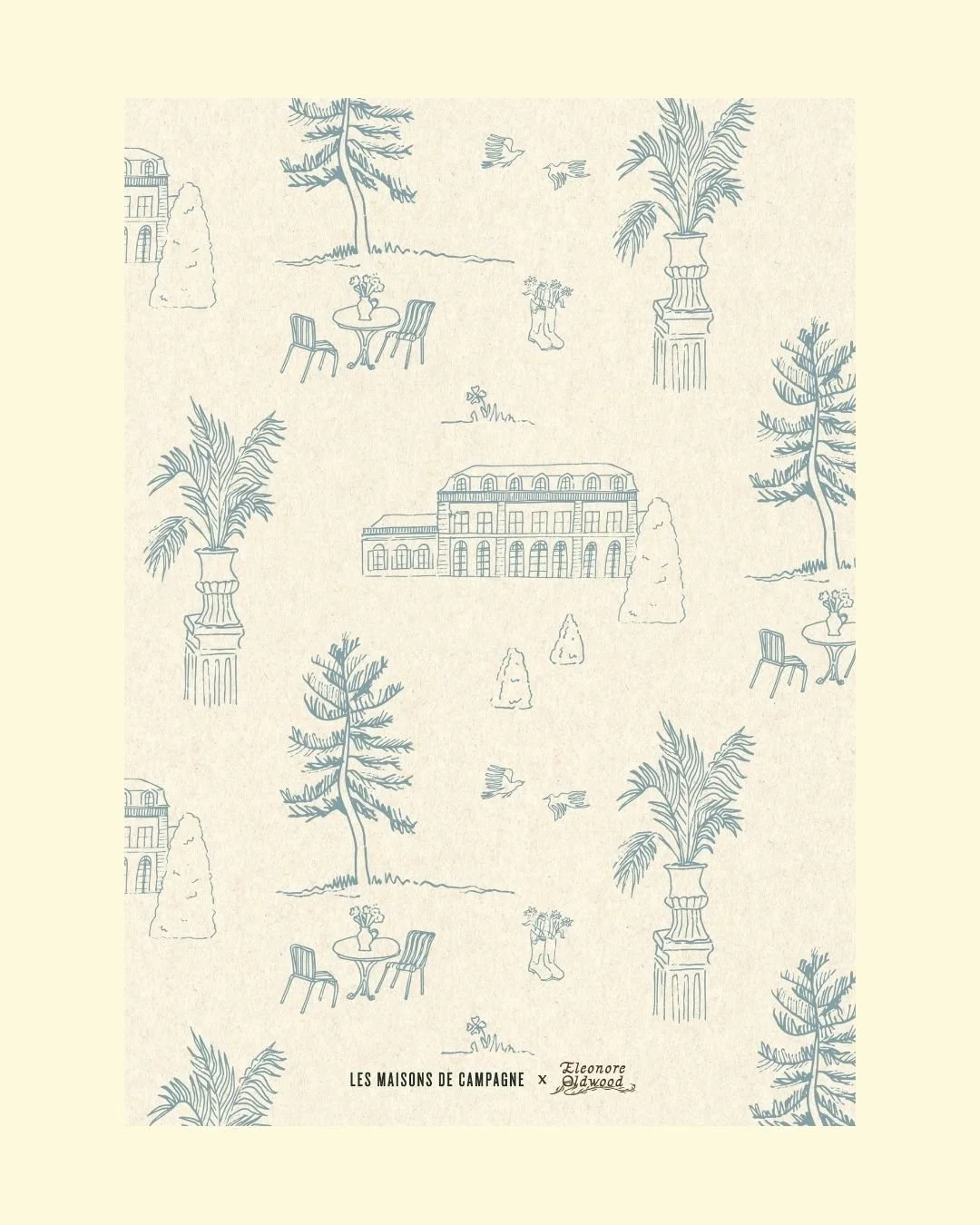 Pour ce projet imaginé en collaboration avec Les Maisons de Campagne, j’ai conçu un motif original inspiré de l’esthétique cottage anglais, pensé comme un véritable support de création. Déployé lors d’un workshop d’aquarelle à l’occasion du week-end de Pâques, ce design a été créé pour être approprié par les clients de l’hôtel dans une expérience créative immersive.